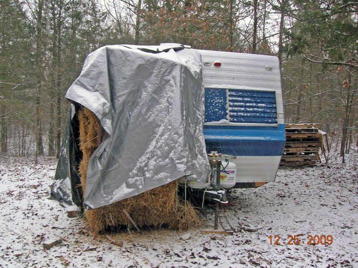 Other than that, the straw bale house is standing up nicely to the elements, even without plaster or gutters. The tarps certainly aren't very charming though. Everything else said and done, I'm enjoying living in the camper. It's cozy, everything is within arm's reach, and it takes 5 minutes to clean from top to bottom. I hope everyone else out there is staying warm and dry.