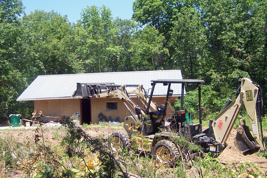 Last week we rented a small backhoe and began excavating the cistern and leveling the front yard. The plan was to dig the root cellar, level the workshop/shed site and dig out the straw bale duplex foundation at the same time, but we managed to break the rear wheel drive and were cut prematurely short after nearly finishing the cistern and leveling much of the front yard area of the common house and making a greywater mulch basin.