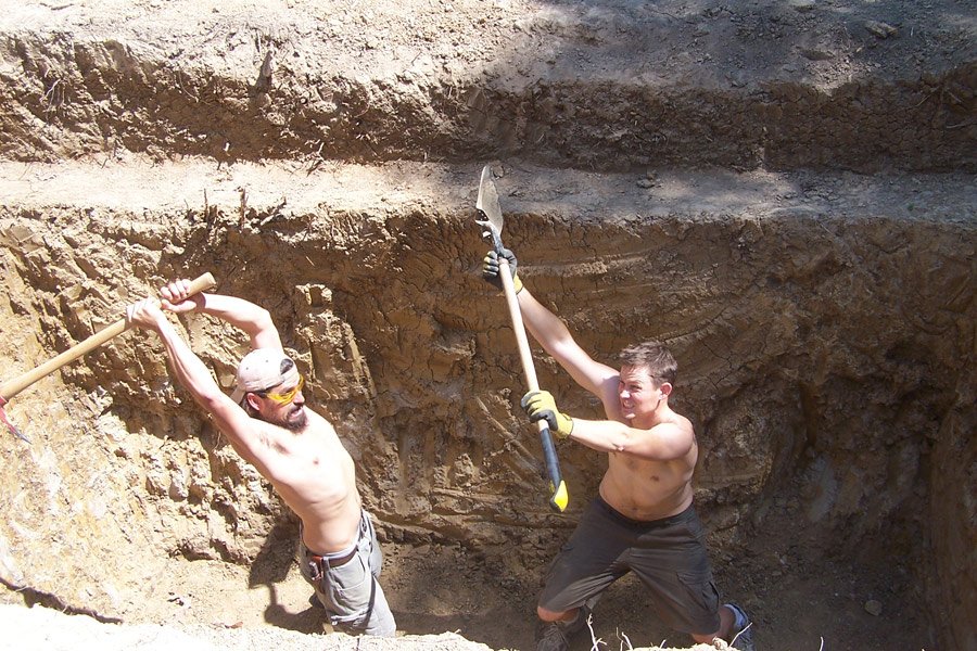 We've spent the last few days digging the ledge to hold the retaining wall and squaring up the hole somewhat, although it doesn't need to be perfect for our purposes. We've still got to dig the trenches for the overflow and outlet pipe runs, but in the meantime though it's perfect for some good old fashioned pit fighting...
