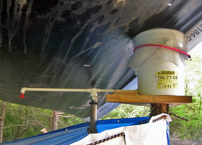 Last year it got pretty tiring hauling the generator up to the garden to run the pump for the solar shower. I considered setting up a small solar power rig, but it just seemed like way more time and money than it was worth. So essentially I built a fancy solar bucket shower. I still heat the water the same way with the black barrels under a clear plastic drop cloth, but now I just pour a couple buckets of the hot water into a small holding bucket with a faucet and shower head I stole off one of the solar shower bags, and whallah. It doesn't have much pressure and it comes out fairly slowly, but I can easily take a shower, wash my hair, and shave on around 2-3 gallons of water. We were easily using 7-10 gallons with the pump system.
