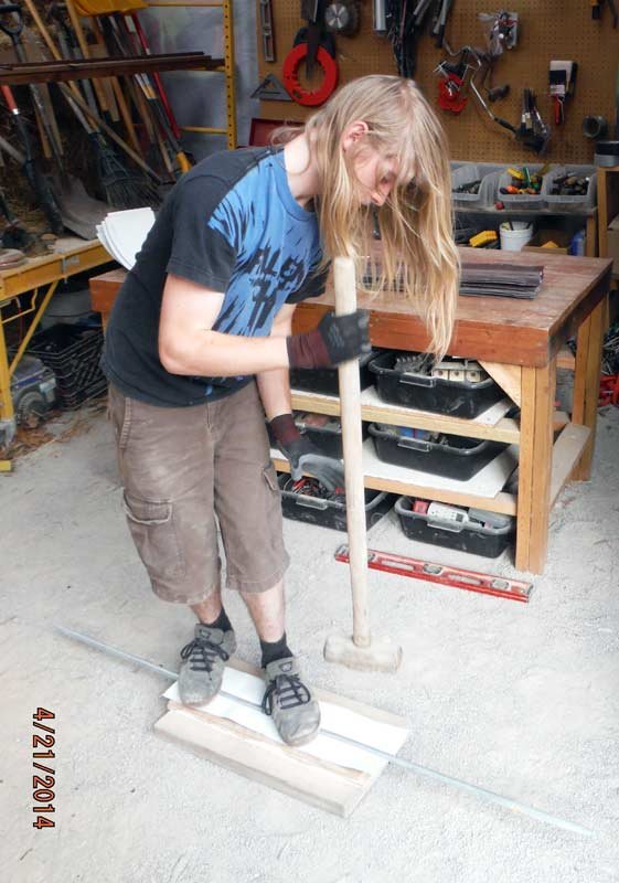 Yesterday was the first day we've really worked on the solar hot water system in the last few weeks. Billy cut up the aluminum flashing and bashed the metal into a form to make the heat absorption fins. He also cut a number of thinner strips that go behind the copper tubing to help transfer the heat to the pipes and then to the water.