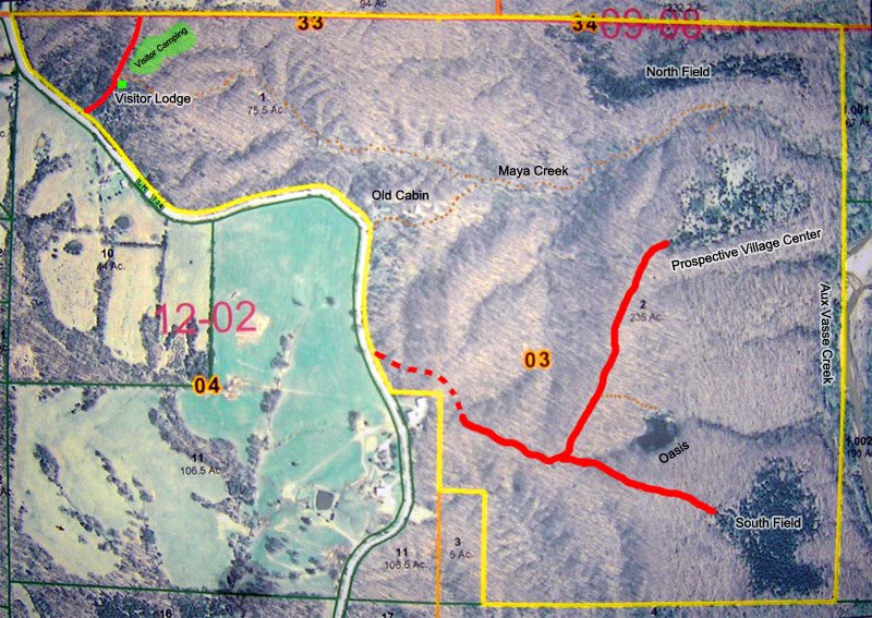 We've also discovered something that has changed our road construction plans for next year. I went down to the county assessor's office and got a print-out of the satellite imagery of our property with the property lines overlayed on it. It appears that we do own the land right along the road all the way down until Jerry Austin's farm equipment area. We'd been under the impression we didn't own the strip directly along the road and so were going to have to build a much longer and more difficult road back to where we plan on building. Now we're looking at simply cutting across a few small gullies and connecting up with the more well-established road back to the lake and middle field beyond it. The other road we'd been planning would have gone along Maya creek and been incredibly beautiful, but would have involved some bridge-building, drainage control, and just a lot of manual labor in general. We'd still like to make a trail along it, but if we can get away without having to do all of that we will.