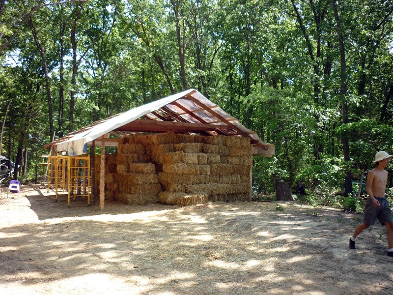 We got the bales for the duplex delivered, but we won't put them in until the base layer of earthen floor finishes drying. It's about $2/bale if you pick the bales out of the field, but we missed our window this year because of the early spring. Last year we pulled bales on the weekend of July 4th, but when we started looking around all of the bales had already been pulled out of the fields. We found a farmer willing to deliver for $3/bale so we went with that. Next time we'll keep an eye out earlier in the year, or find someone to let us know when they're ready for us to pick them up.