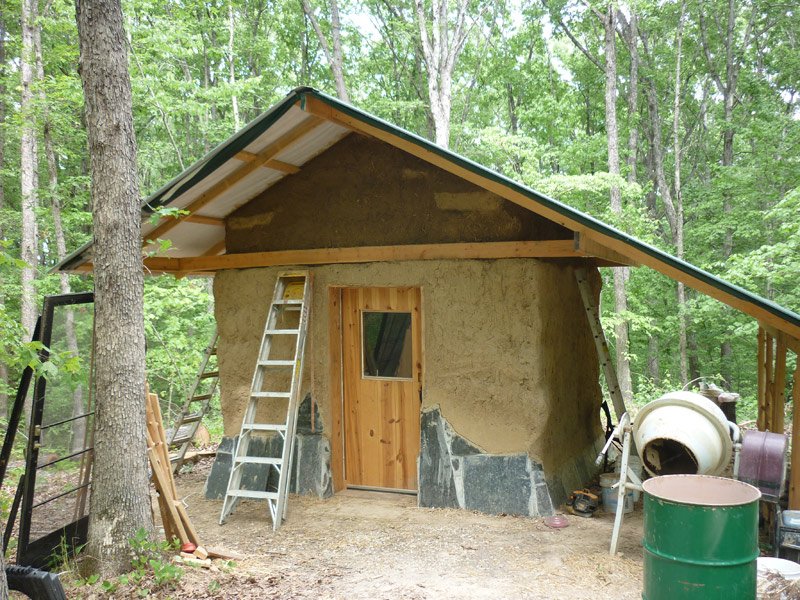 We've also done some work on John's cabin. We've cobbed in the open areas in the roof except for a spot in the back where he's putting in a flue for a small rocket stove. We've also put the first coat of earthen plaster on the roof bales and started on the second coat of plaster, or infill coat, on the lower part of the cabin.
