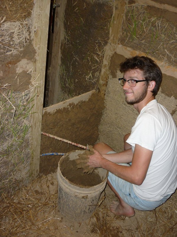 I'll be heading up the work on the common house and the rainwater catchment system and cistern. Over the last several weeks we've put in a little less than half of the interior walls using rammed straw lightly coated with clay. Because the forms won't fit over things like light switches, outlets, and plumbing that sticks out of the wall we're using cob to fill in around those spots. We're also using cob at the top of the walls since there's no space to ram the straw down if you put the forms all the way to the top. So far it seems to be working well.