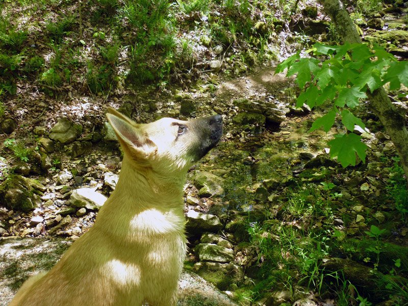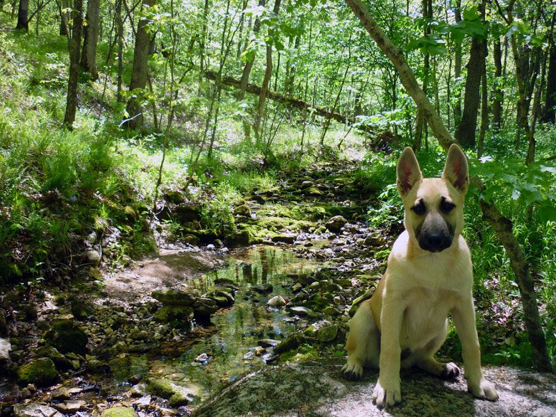 Watching her play makes any stresses I have seem silly. She's dug out a big crater in the middle of my sand pile, and I'm pretty sure she'd dig a den under a tree if given the opportunity. Also, she's always picking up sticks, but we're still working on the finer points of "fetch". Her favorite parts of our walks are when we take a break down by the creek and she goes bounding up and down it.