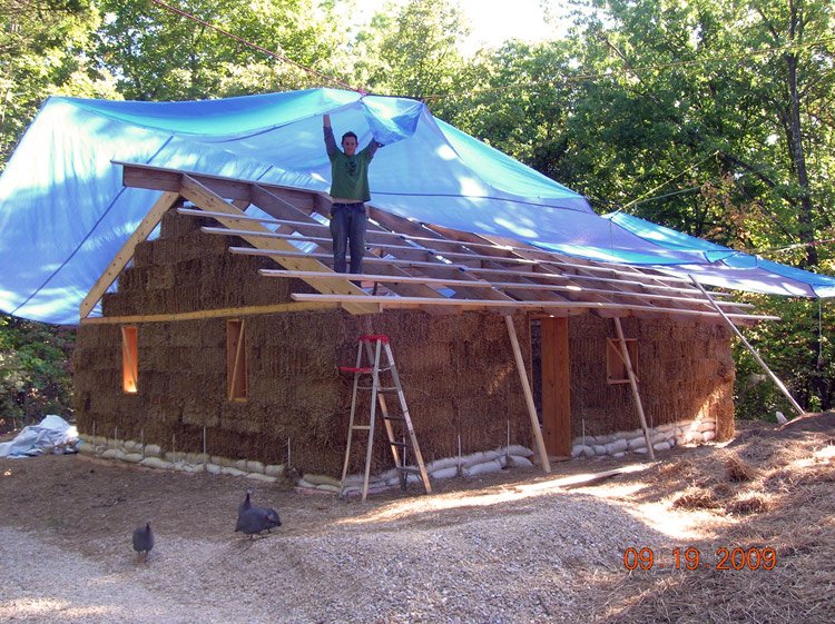 The big news is that the roof is going up quickly. Probably one of the few things that's going faster than I anticipated. The weather has been exceptionally cooperative, all the same, we are running out of time before the cold moves in so I've strung two large blue tarps over the site so that we could possibly work even if the weather wasn't great and wouldn't have to go through the labor intensive process of covering and uncovering the walls every time the weather got bad.