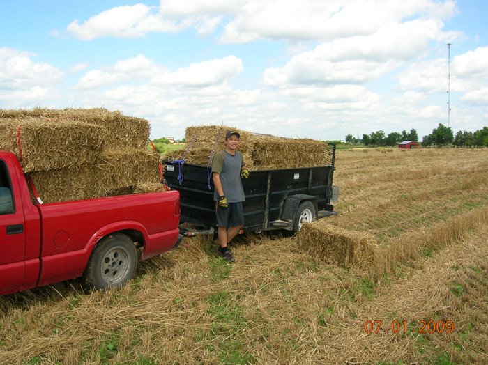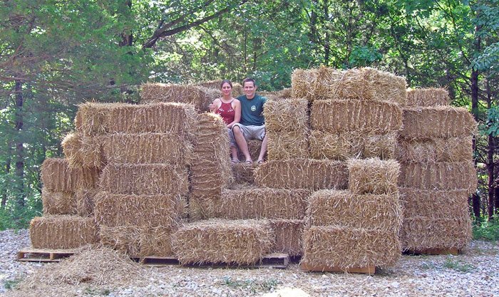 While not much has gotten done on the building in the last couple weeks, that's about to change. Last week we collected 300 straw bales left in the field for us by a very cool farmer about 30 minutes from us. We had the bales sized and tightened to our specs and he only charged us $2/bale well under the average $3.50/bale, mainly because we picked them up out of the field rather than him having to collect and stack them himself. It took us about 6 trips with 2 trucks and a rented trailer to get them all. The hauling and stacking was satisfying but it did leave some nice scratched up forearms.