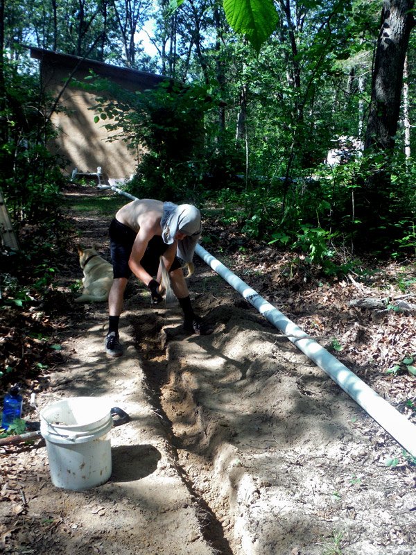 We've also been digging a 100' long 2' deep trench to lay some PVC pipe in and use as a very simple geothermal cooling/heating system called an earth tube. I'm mostly concerned with the cooling side of it, though it should decrease the already small amount of firewood I need in the winter.