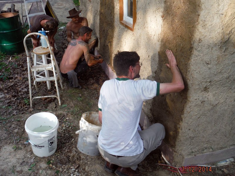 I originally planned on working on getting the inside of the common house finished, but after more detailed planning I saw that I needed a lot of carpentry work first that wouldn't be easy to use volunteer help on so instead we've been working on getting the 2nd, and most labor/material intensive, coat of plaster on the cabins. The small single cabin now has it's 2nd coat completed and we're well on our way to getting the duplex coat on.