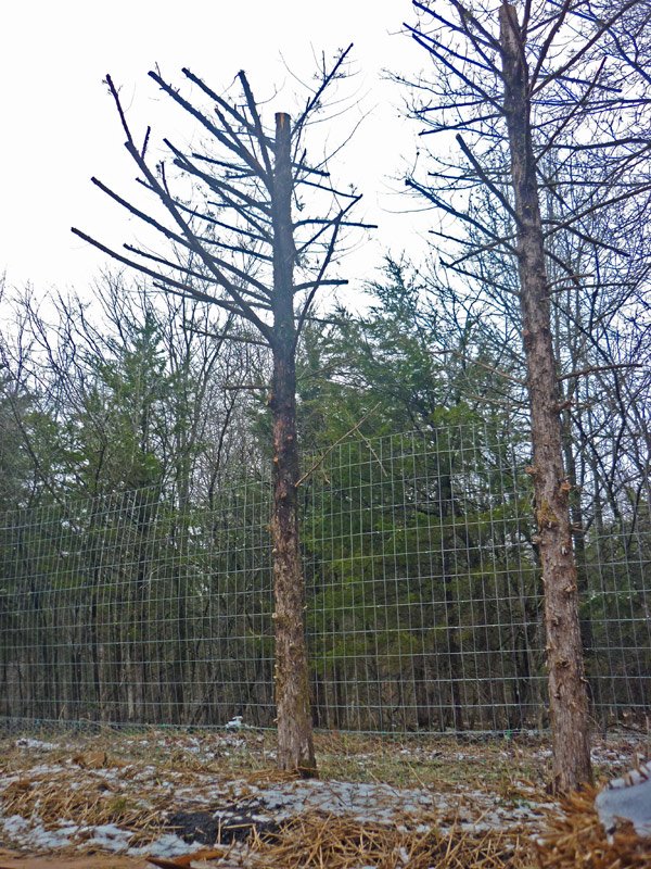 Cedars don't coppice so these should die now and be resurrected as hop trees. I think I can train them to grow up the fence and then into the structure of the cedars. It might be kind of a pain to harvest, but it's worth a try, and if I have to I'll just cut the rest of the branches flush and use string.