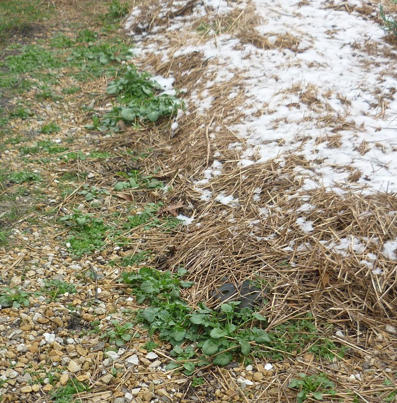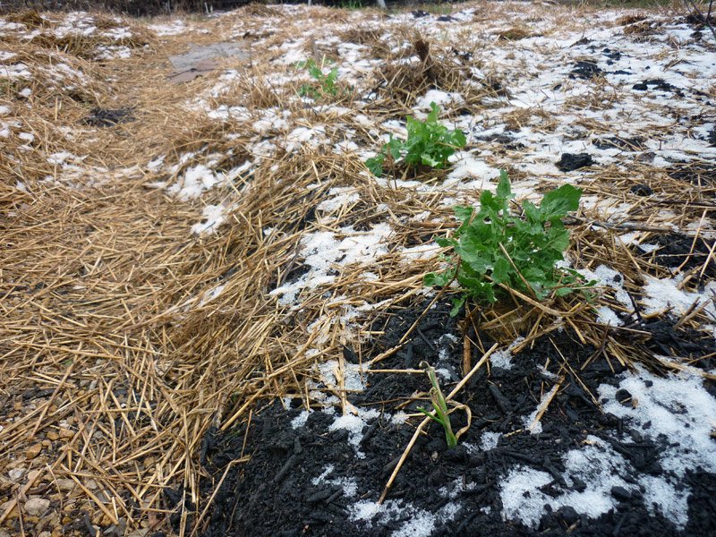 In all the paths I've thrown down some dutch white clover seed, which is a really low-growing clover, and like all kinds of clover it fixes nitrogen. There's a ton of wild mustard, some kind of parsley, and a kind of deep-rooted plant I haven't identified yet, growing in all the beds and paths. I'm in the process of re-wiring my brain not to see them as weeds. I've been pulling some of them out and throwing them in the compost pile, but to make it seem less like weeding, now I think about it as harvesting nitrogen.