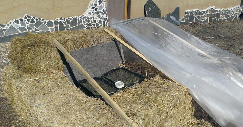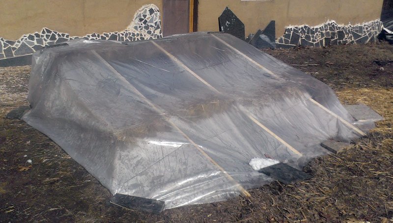 I made a rectangle from 8 old hay bales someone gave me and then stacked another 3 bales on the north wall of it. Then I put down about 6" of straw within a rectangle to insulate the floor and then draped a clear plastic drop cloth over a few 2x2 boards. I secured the drop cloth with some of the scrap chunks of granite I have for various projects, mainly the footing around the straw bale buildings.
