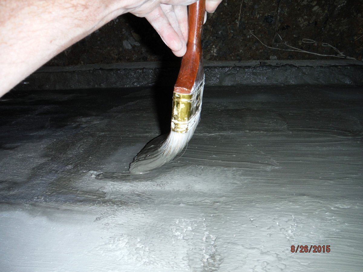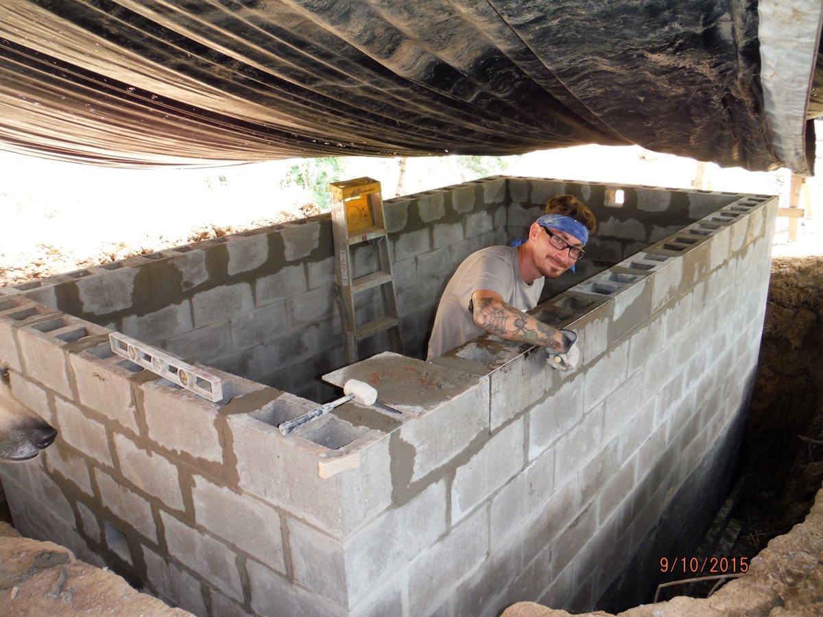 Once the blocks were in place we filled in all of the block holes with concrete that we hand-mixed. It took us 4 days to mix and fill all of the blocks. We also placed some anchor bolts as we went to attach the wooden roof cap later. I also went around the outside of the cistern and put 3 coats of potable cement paste on the outside of the cistern to minimize any toxins leaching out from the cinder blocks.