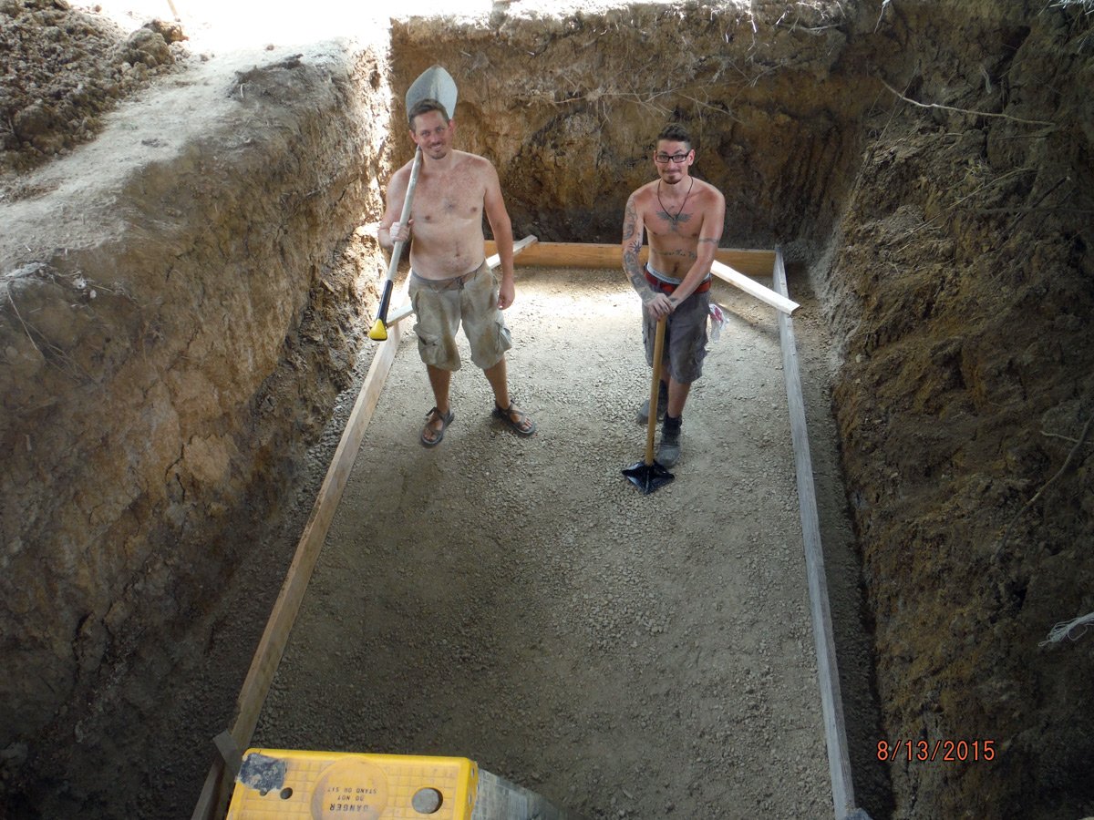 It took Eric and I probably 2.5 weeks of hard work to get it all cleaned up and leveled out. The next step was laying sub base gravel for underneath the concrete slab. The cistern will hold almost exactly 4,000 gallons or 16 tons of water, not to mention the weight of the concrete-filled cinder block walls and wooden cap, so having a thick sub base and thick foundation slab were important. We tamped down and leveled 8" of 1" minus gravel (~10 tons).