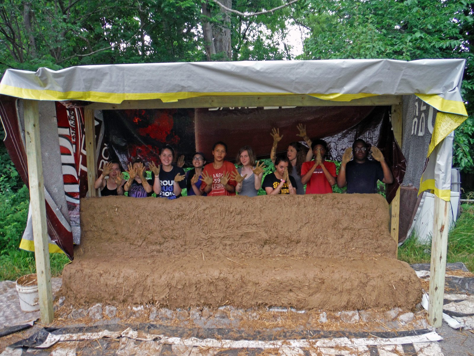 Right after the reunion, my volunteers and I spent a couple days working with a group of young people working with the C.A.R.E. gallery, a summer program run by the city of Columbia and the Missouri Arts Council, to build a strawbale/cob bench at the main CCUA(Columbia Center for Urban Agriculture) farm in Columbia.