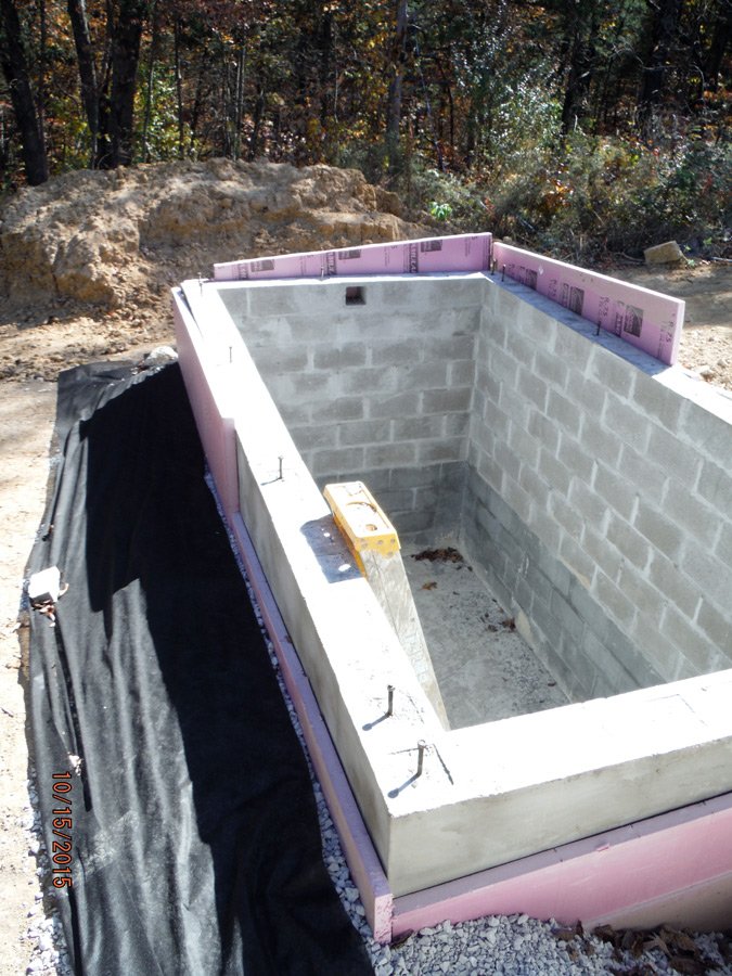 We let the slab set for a week or more before we started in on the block walls. I should have gotten concrete blocks not cinder blocks since cinder blocks contain fly ash which is toxic, but I didn't realize it until I'd already bought, hauled, and unloaded all of them. To get around that I'll be putting several more coats of potable cement coating than I'd planned and then do testing before I use the water.