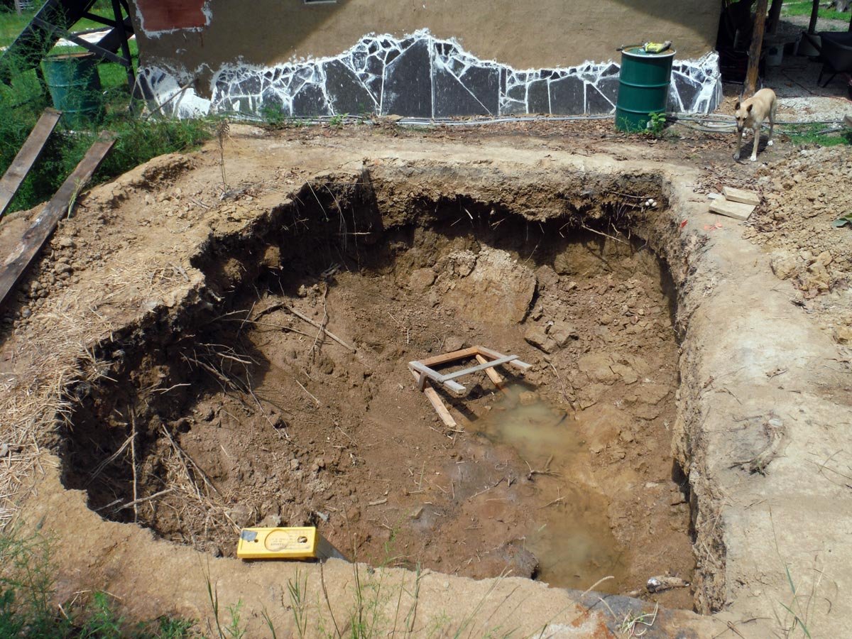 After that it was on to dealing with gaping mud pit that the cistern hole had become after 3 years. Last Fall we spent a lot of effort cleaning it up again only to have the monsoons this Spring deluge it and cause the sides to collapse. Any hope I had for letting it dry out to make work easier evaporated unlike the water in the foot or more of clay mud at the bottom, so we sucked it up, pulled our shoes off and jumped into the muck.