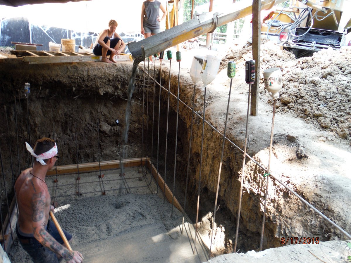 Once the blocks were in place we filled in all of the block holes with concrete that we hand-mixed. It took us 4 days to mix and fill all of the blocks. We also placed some anchor bolts as we went to attach the wooden roof cap later. I also went around the outside of the cistern and put 3 coats of potable cement paste on the outside of the cistern to minimize any toxins leaching out from the cinder blocks.